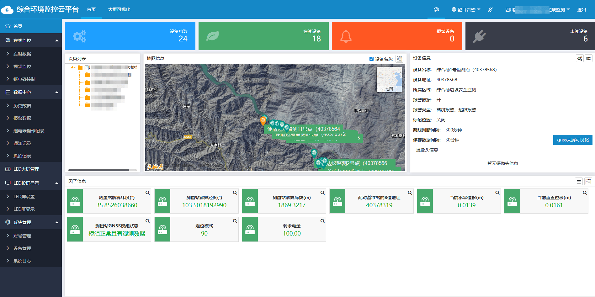 2.环境监控云平台:作为系统的“大脑”,承担数据接收、解算、分析、预警和管理等多项功能。可实时接收监测站通过4G网络上传的位移数据,通过专业算法完成数据解算,生成直观的位移变化曲线和监测报告;支持多终端查看,管理人员可通过电脑、手机随时随地掌握边坡动态,当监测数据超出安全阈值时,系统自动发出预警,实现远程管控、快速响应。